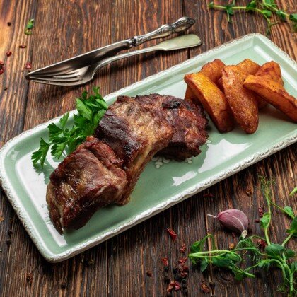 Свиные ребрышки в соусе BBQ с картофельными дольками